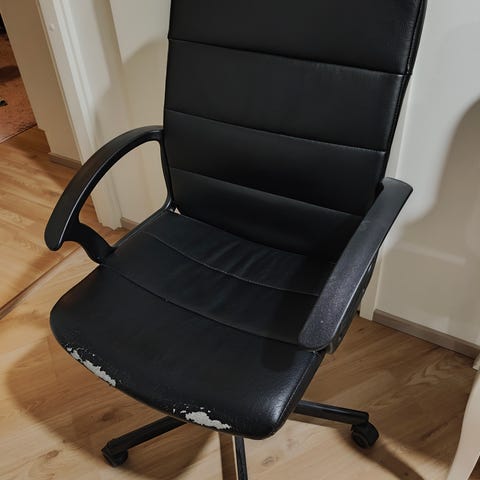 Sininen työtuoli. Vähän jo elämää nähnyt mutta toimiva ja hyvin rullaava!