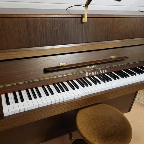 Tästä seuraavalle muusikolle kaunis vaalea pienikokoinen Hellas pystypiano.