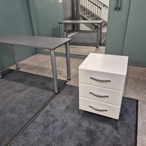 Valkoinen työpöytä, leveällä vetolaatikolla.