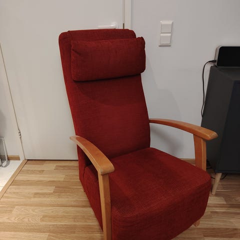 Vaaleanpunainen tekstiilipäällysteinen nojatuoli metallisella jalalla. Melko painavan oloinen, menee riskillä henkilöllä yksin mutta tarvittaessa oma kantaja mukaan. Pikkurahalla mukaan. Löytyy myös toinenkin samanlainen!