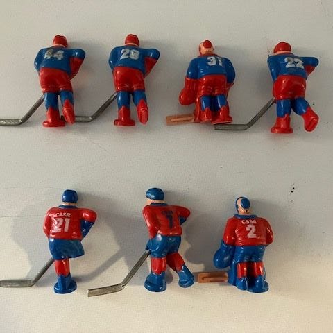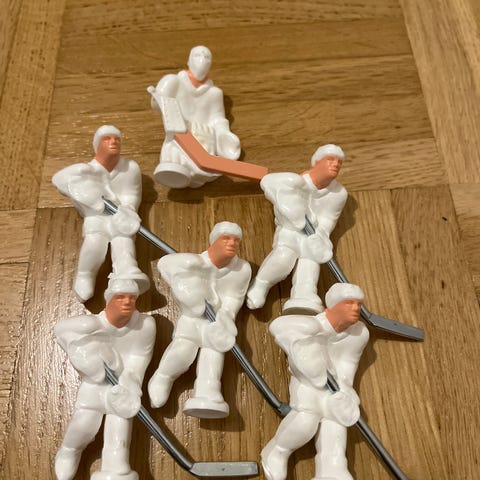 Vanhoja pöytäjääkiekko/pöytäjalkapallo peliukkoja.ylhäällä kuvassa muutama rikkinäinen ukko.10e koko kasa.
