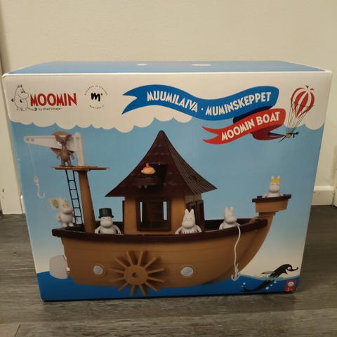 Muumilaiva ja hahmot sekä Muumi -eväslaatikko vaikka hahmojen säilytykseen.