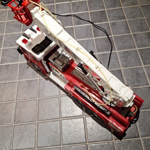 Teleskooppi tilkaat ja korissa vesiletku jolla voi ampua vettä. Hälytys äänet ja valot myös. Kaikki toimii.