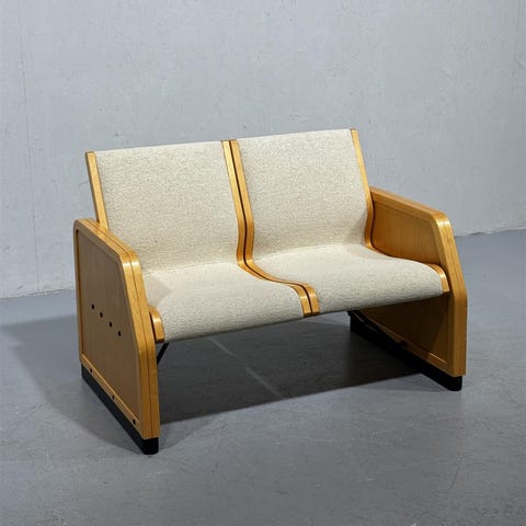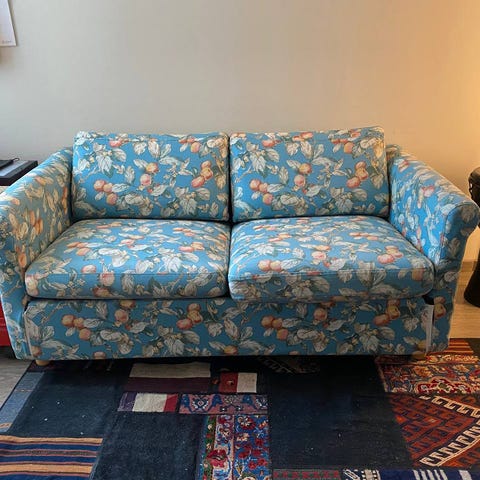Kaunis sohvapenkki, valkoinen ja siniraidallinen kuosi.