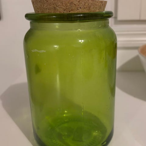 Jysk keittiötarvike, lasipurkki, jossa on valkoinen kansi ja pitsinen koriste, jossa nappi. Purkki soveltuu säilytykseen keittiössä.