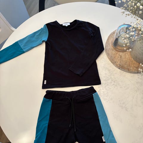Mukaan itse ommellut shorsit samalla tyylillä. Sävy on sellaine sinivihreä. Moitteena keskisauman päälitikkauksen katkeaminen paikoin. (Sauma ei siis kuitenkaan ratkea kun alla on kuitenkin saumurin sauma).