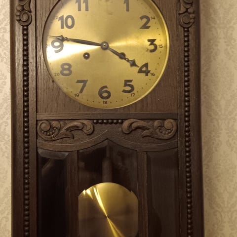 Kaunis seinäkello, joka käytetty kellosepällä, mutta edellyttää toimiakseen täydellisen tasauksen.
