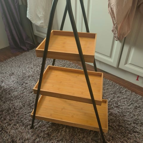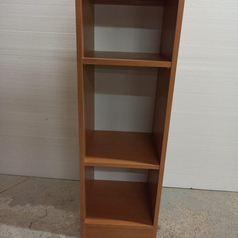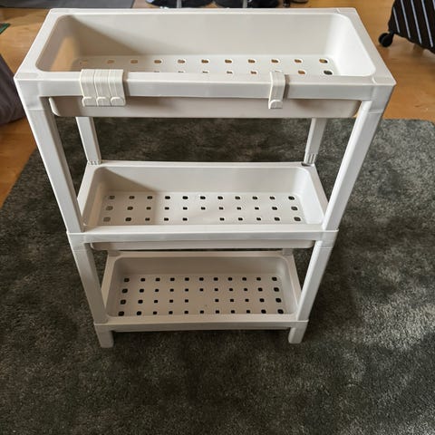 Uusi,valkoinen hyllykkö kolmella hyllyllä sekä rattailla olevalla.Syvyys alimman hyllyn mukaan 40,5cm.Kaksi ylimm.hyllyä pienempiä.