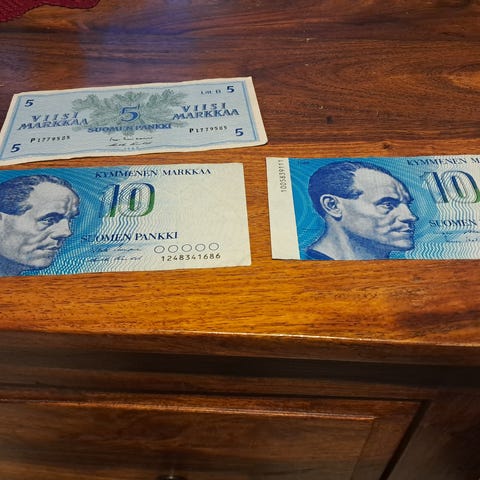 keräilykolikoita ja muutama seteli 20 ,5, ja 1 markkaa