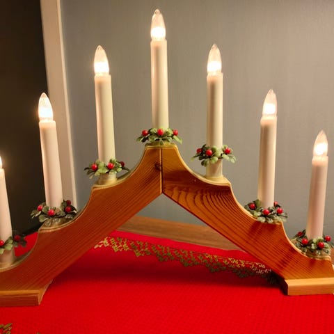 Kaunis puinen kynttelikkö, sisällä lasi kynttilälle.