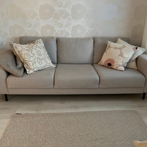 2:n istuttava divaanisohva, Gransel lounnonvärinen. Alkuperäinen hinta 749 € (ostettu syksyllä 2024). Pienet tahrat (näkyvät kuvissa) saa pois pesemällä. Sohvan osia voi käyttää erikseen tai yhdistettyinä eri tavoin. Päällinen on valmistettu Gransel-kankaasta, jossa on pellavaa ja viskoosia. Konepestävä päällinen on helppo irrottaa ja laittaa takaisin paikalleen.