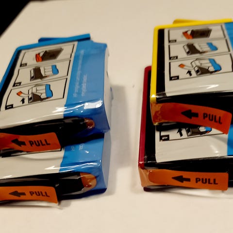 HP:n alkuperäiset värikasetit ja pakettien sinetit ehjät.