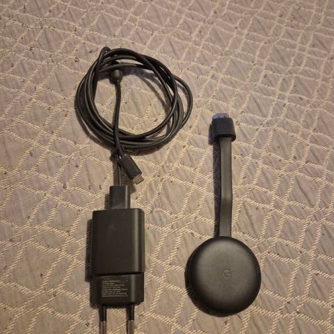 Kolmas sukupolven Google Chromecast mediatoistin ja alkuperäinen USB-virtalähde.