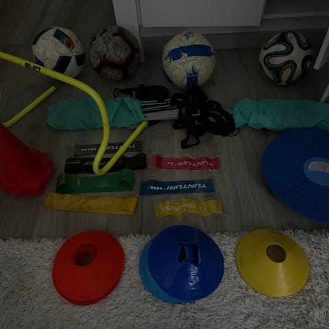 Täysin uusi ja avaamaton jalkapallon harjoitussetti. Paketti sisältää: 1 kpl Jalkapallo 4 kpl Keltaisia harjoituskartioita 4 kpl Harjoitustolppia