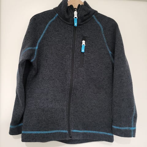 Kauluksesta leikattu siististi rikkinäinen vetoketjun suojakangas pois, ei vaikuta käyttöön. Lisäksi pari tummaa tahraa, jotka eivät lähteneet pesukoneessa, mutta joihin en kokeillut paikallista tahranpoistoa.