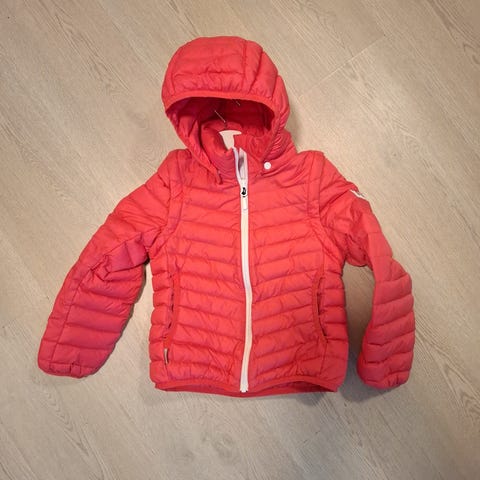 Siisti, yhdellä pidetty kevyttoppatakki. Tummentumakohtia paikka paikoin, ehjä. Nimikoitu.