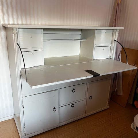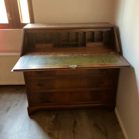 Puinen vanha piironki klaffipöydällä ja kirjoitusalustalla. Jonkin verran käytön jälkeä,mutta ehjä pöytä.