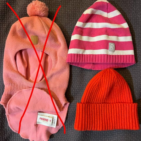 Kaksi samanlaista Reiman pipoa. Kaksi lähes samanlaista kypärämyssyä. Mielestäni toinen "isompi" 80/86 vastaa toisen kokoa joka on 44-46. Jotain ajan kellastumia on myssyissä, ei häiritsevästi mielestäni.