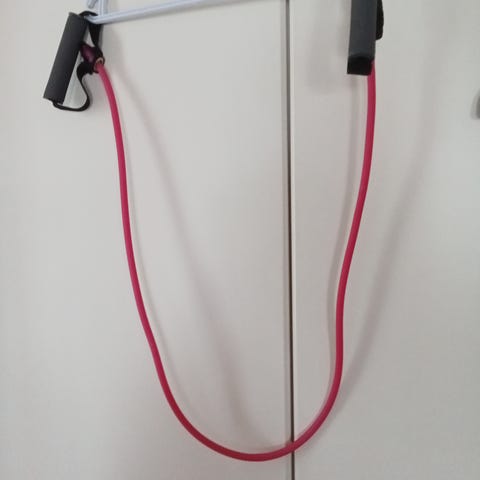 Monitoiminen vastuskuminauhasetti sisältää useita vaaleanpunaisia vastuskuminauhoja, kahvoja ja kiinnitysvälineitä. Setti soveltuu erilaiseen voimaharjoitteluun ja kuntoutukseen.