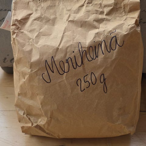 Tuolien verhoilusta yli jäänyttä meriheinää puolikas isoa pussia. Säilytetty kuivissa sisätiloissa.