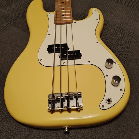 Fender American Performer Precision Bass sähköbasso, sininen runko ja vaahterakaula.