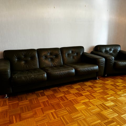 Myydään mustavalkoinen nahka sohva ryhmä tarpeettomana. Ryhmään kuuluu kolmen istuttava sohva, kahden istuttava sohva, olohuoneen pöytä, tv taso ja kaksi pienempää sivupöytää. Kaikkien pöytien ja tv tason päällinen lasia. On käytönjälkiä, ei uudet.