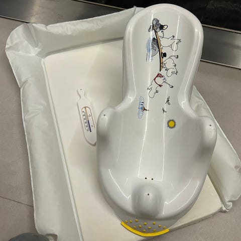 Annetaan pois vauvojen kylpyamme ja kylpytuki. Näitä on käytetty paljon, mutta toimivat edelleen tarkoitukseensa moitteettomasti ja ovat ehjiä. Nouto Meilahdesta.