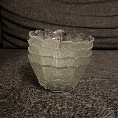 4 lasista jälkiruokakulhoa. Voit säilyttää myös pinottuna. Kulhon korkeus 6cm, halkaisija 10cm. Käytössä olleita, ehjät ja siistit.