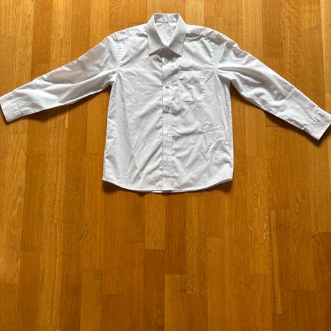 Noin 130cm (koko 8/9 tanska) vaaleansininen siisti kauluspaita ollut kerran tai pari käytössä. Laadukkaan oloista napakkaa puuvillaa. Kivat yksityiskohdat helmassa ja nappilistassa. Ei kotieläimiä eikä voimakkaan hajuisia pesuaineita taloudessa. Haku Eko-Viikistä.