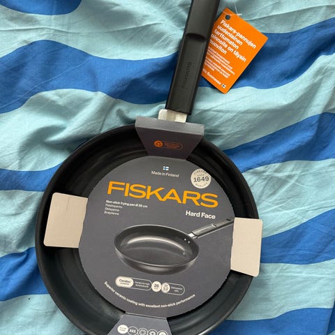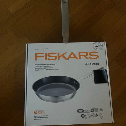 Uusi ja käyttämätön, yhä myyntipakkauksessaan oleva Fiskarsin teräspannu.