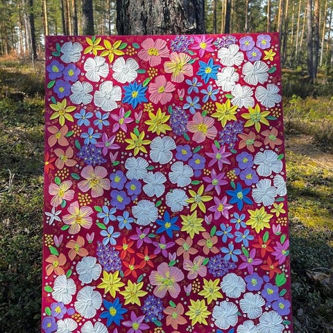 Original Acryl-taulu, jossa on värikäs kukkakuvio tummansinisen pohjan päällä. Taulun pinnassa on kohokuviointia, joka korostaa kukkien muotoja ja värejä. Kehystetty puukehyksellä.ilman kehys hinta-25e