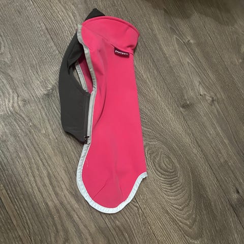 Itse ommellut kuminauhat takajalkoihin jotta pysyy paremmin päällä. Halutessa onnistuu helposti ja nopeasti poistamaan.