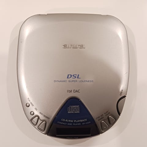 Hyvässä kunnossa cd-soitin. Toimii kahdella AA-paristolla tai akulla. Paristojen säästämiseen voi käyttää normaalia puhelimen 5v laturia. Saa myös käyttää AA-akkuja ja ladata niitä puhelimen laturilla.