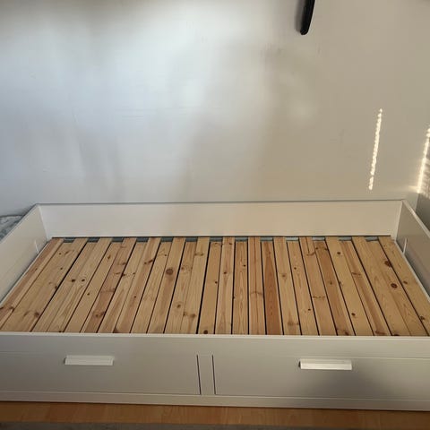 Myydään muuton vuoksi Ikea Brimnes -levitettävä sänky kahdella tilavalla säilytyslaatikolla.