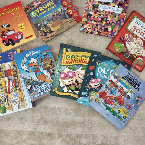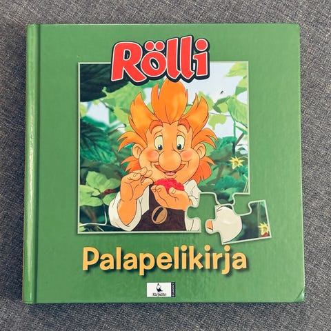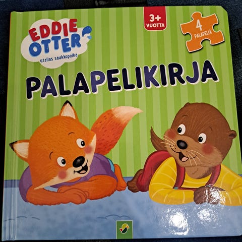 Kirja tekstiä ja 6 palapeliä, kaikki palat tallessa, kansissa kulumaa.