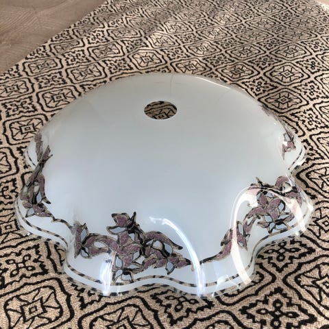 Musta Granitista ostettu kattolampun kupu + mukana tullut johto. Kuvun halkaisija 40 cm, sisäpuoli valkoinen. Metallia.