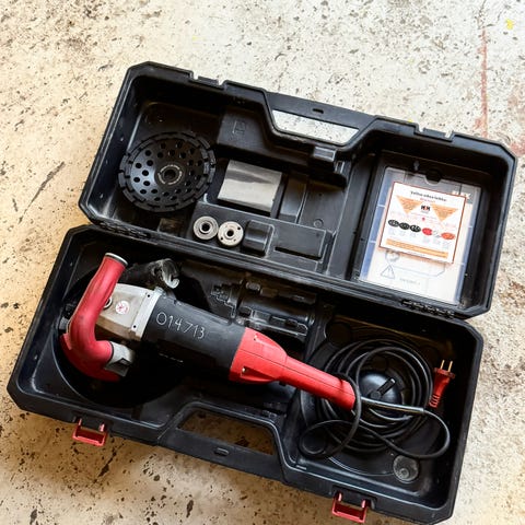 Loistava kone parketin tai vaikka betonin hiontaan. Voi käyttää myös lattian hoitokoneena. Ehjä ja toimiva kone, mutta lattiaa vasten olevassa muovisessa pölykauluksessa muovi reunassa halkeama.