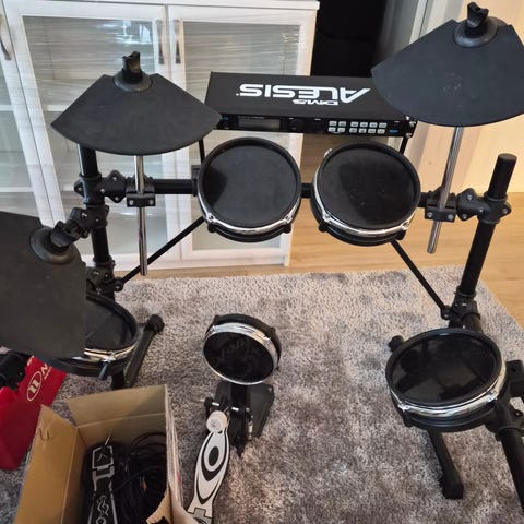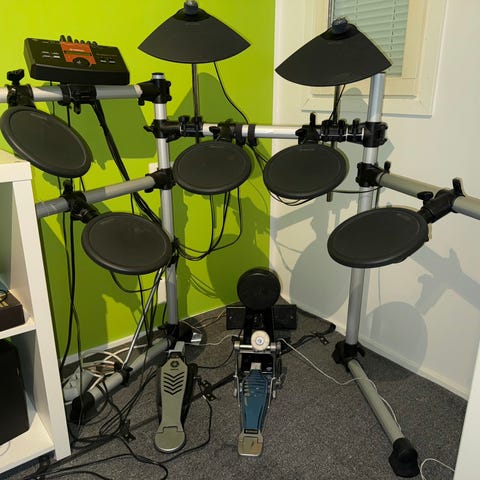 Käytetyt sähkörummut, sekä jakkara ja yhdet kapulat. Ei sisällä kuulokkeita.