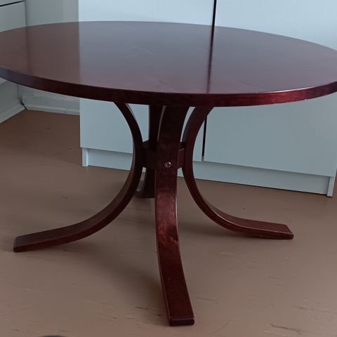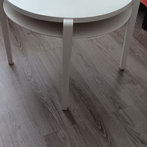 Pyöreä, 4:llä jalalla. Pinta melamiinia joka maalattu valkealla kalustemaalilla.