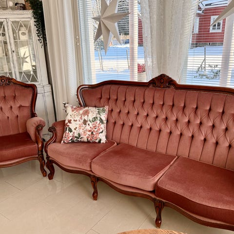 Myydään todella hyvässä kunnossa olevat talonpoikais rokokoo -henkiset sohva ja kaksi nojatuolia.