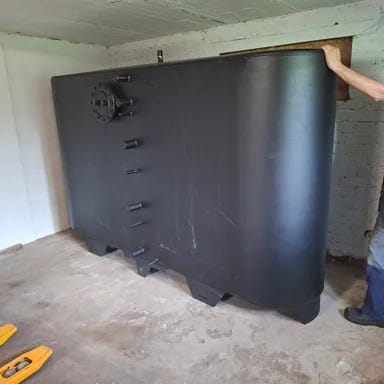 Nostettaessa kellariin siihen tuli muutamia pieniä naarmuja. Säiliöön materiaali on RST teräs - paljon kestävämpi. Varustettu anodilla. Alhaalla on mahdollisuus laittaa lämmityselementtin (2” tulppa).