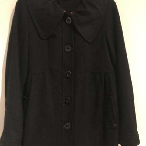 Mustavalkoharmaa villasekoitteinen, eläväpintainen ja pörhäkkä ”buklee” takki, 50% villaa. Tarkemmat materiaalitiedot kuvissa.