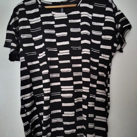 Neulomon tunika, koko XL. Pituus olka- helma noin 87 cm. Hiha laskeutuu 3/4 osa hihaksi. Hivenen kapenee helmasta.Materiaalissa 15 % villaa.