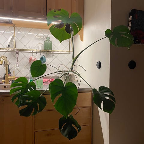 Monstera Deliciosa huonekasvi, jossa suuret vihreät lehdet. Kasvi on saviruukussa ja tukikepeillä tuettu. Ruukun halkaisija 30 cm ja korkeus 25 cm. Kasvin korkeus n 65 cm ja levyeys n. 65 cm.