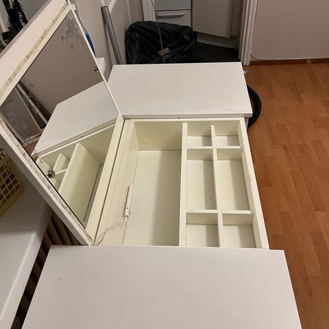 Meikkipöytä, sivupöytä, työpöytä. Erityäin käyttökelpoinen, tukeva, pienestä jäljestä huolimatta. Huom! Annetaan, ei kuljetusmahdollisuutta!