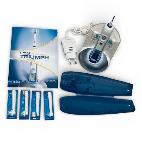 Puhdistettu ja hyvä kuntoinen sähköhammasharja laturilla.