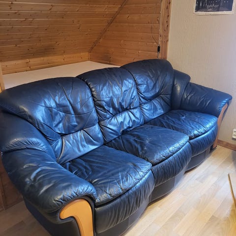Annetaan muuton tieltä valkoinen nahkasohva, vähän upottaa toinen istuin ja kulumaa/pinttymää värissä. Muuten siisti.