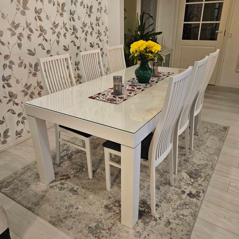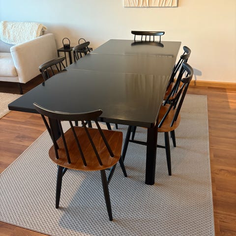 Hyväkuntoinen ruokailuryhmä keinonahkatuoleilla. En tiedä merkkiä. Tilattu uutena 2020 Furniturebox nimiseltä nettisivustolta. Mukana 50cm jatkopala pöytään.