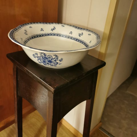 Lasituksen alla posliinissa pientä halkeamaa, mutta onhan sillä ikääkin n. 100 vuotta. Reunat ehjät. Pohjan leimat epäselvinä painumina.
