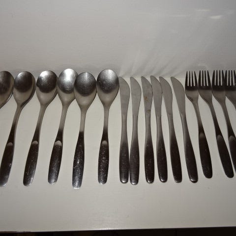 6 kpl ruokailuveitsi ja 6 kpl ruokailuhaarukka.